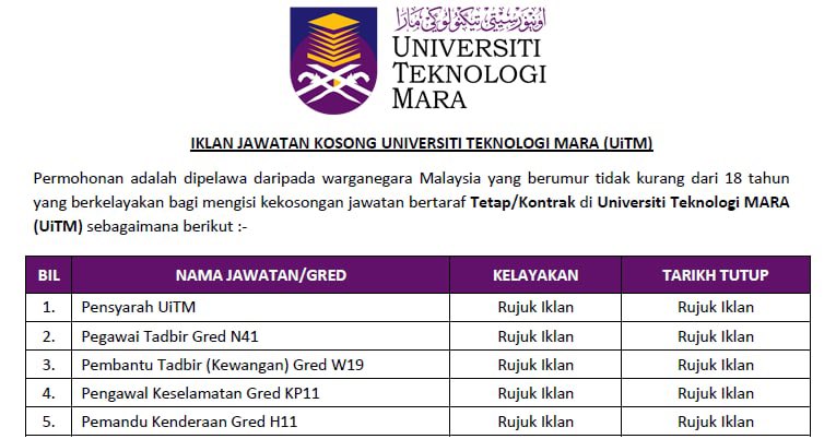 Jawatan Kosong On Twitter Jawatan Kosong Universiti Teknologi Mara Pensyarah Uitm Pegawai Tadbir Gred N41 Pembantu Tadbir Kewangan Gred W19 Pengawal Keselamatan Gred Kp11 Pemandu Kenderaan Gred H11 Https T Co J4eex7h97w Belum Ada